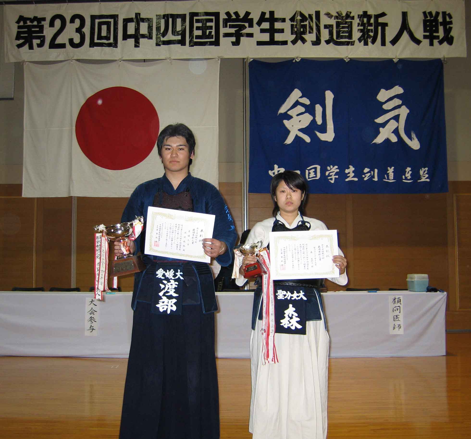 結果トーナメント 男子団体戦の部 優勝大学 愛 媛 大 学 A 女子団体戦の部 優勝大学 聖カタリナ大学B 男子団体戦の部 最優秀新人賞 渡 部 敬 裕(愛媛大学) 女子団体戦の部 最優秀新人賞 森 美 耶 子(聖カタリナ大学)